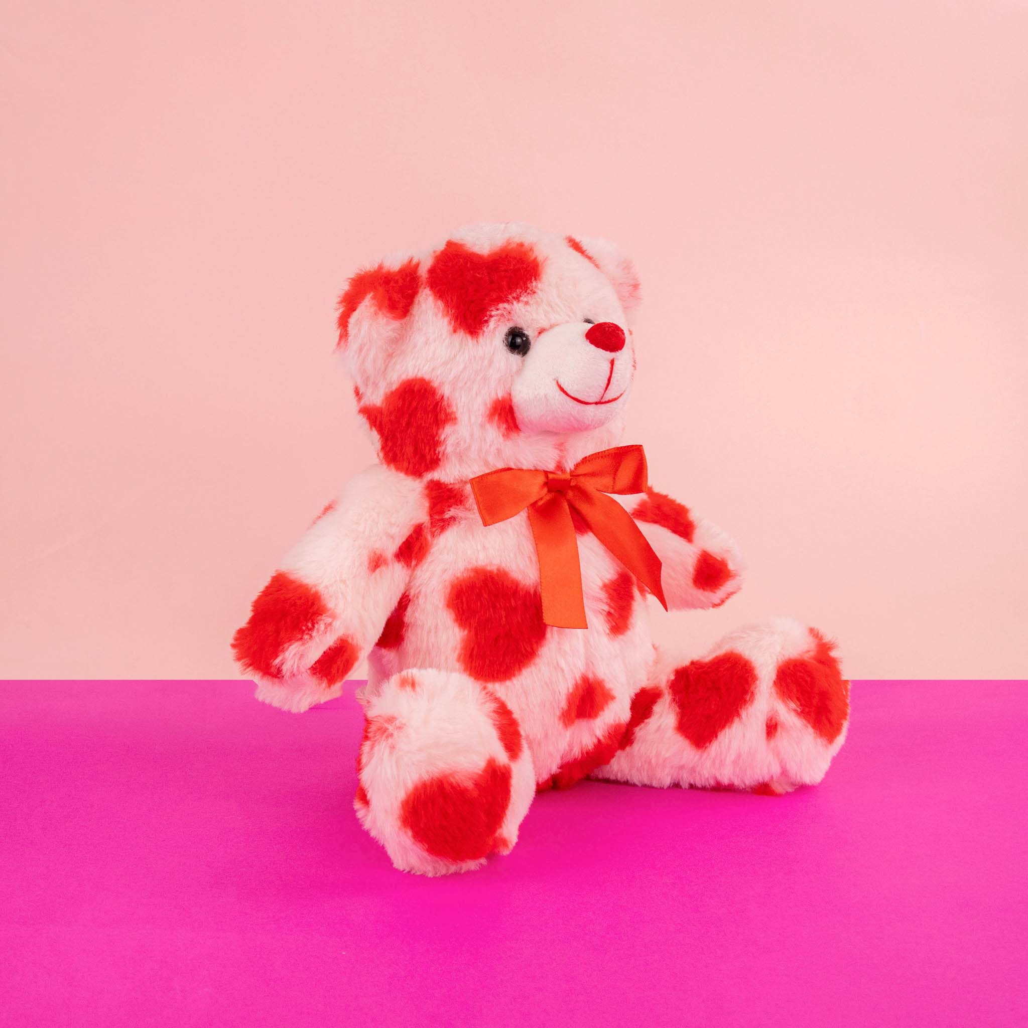 Este oso de peluche con estampado de corazones es súper lindo y adorable, perfecto para llenar de ternura cualquier momento 🌸🥰Con su pelaje suave, su carita encantadora y esos corazoncitos por todo su cuerpo que lo hacen único,